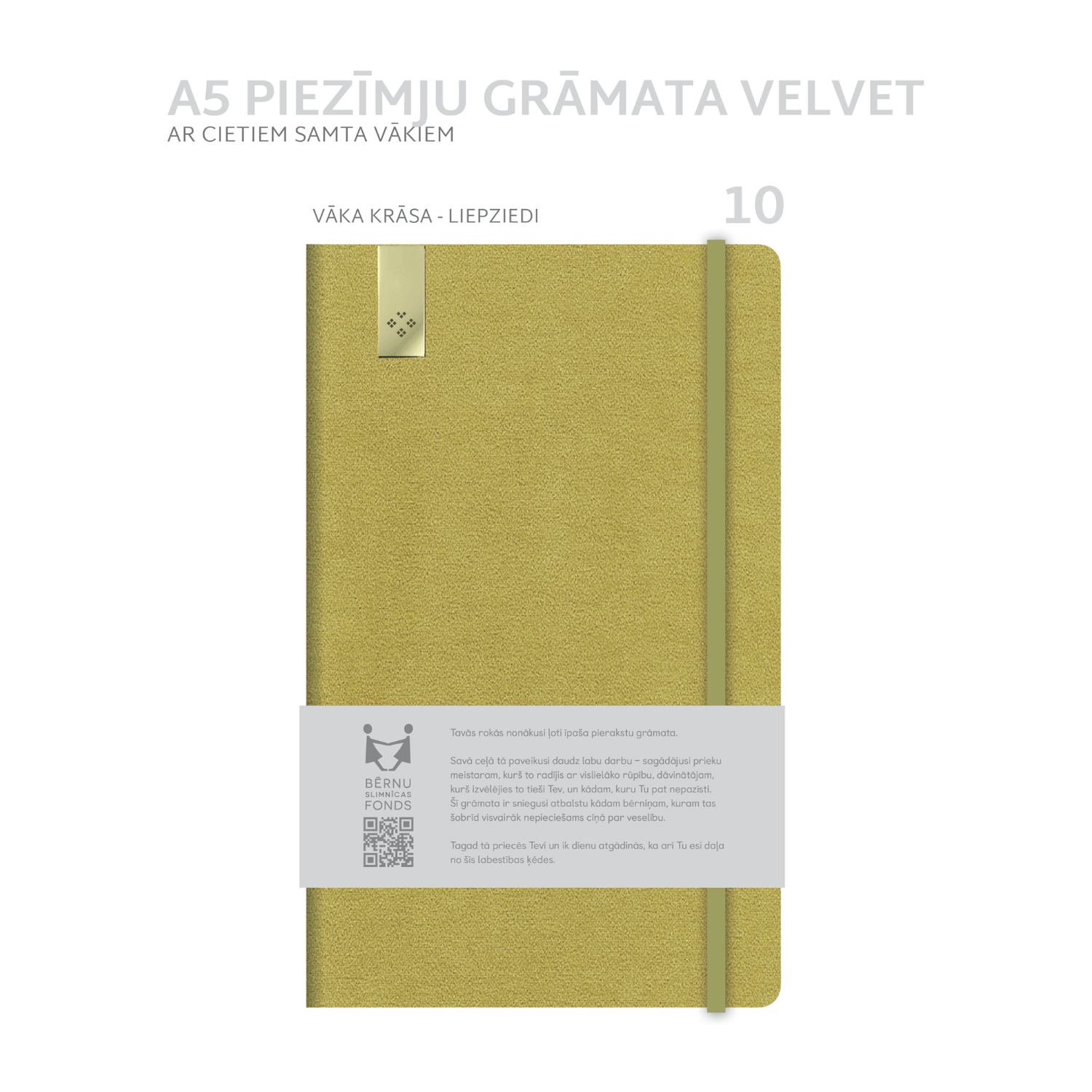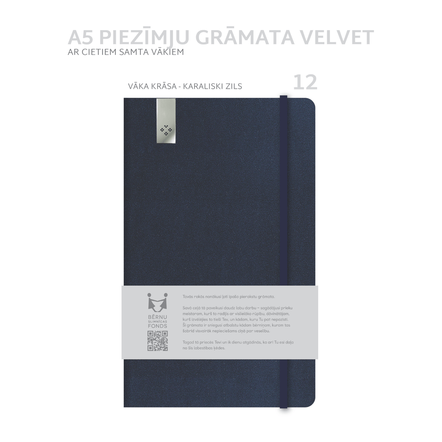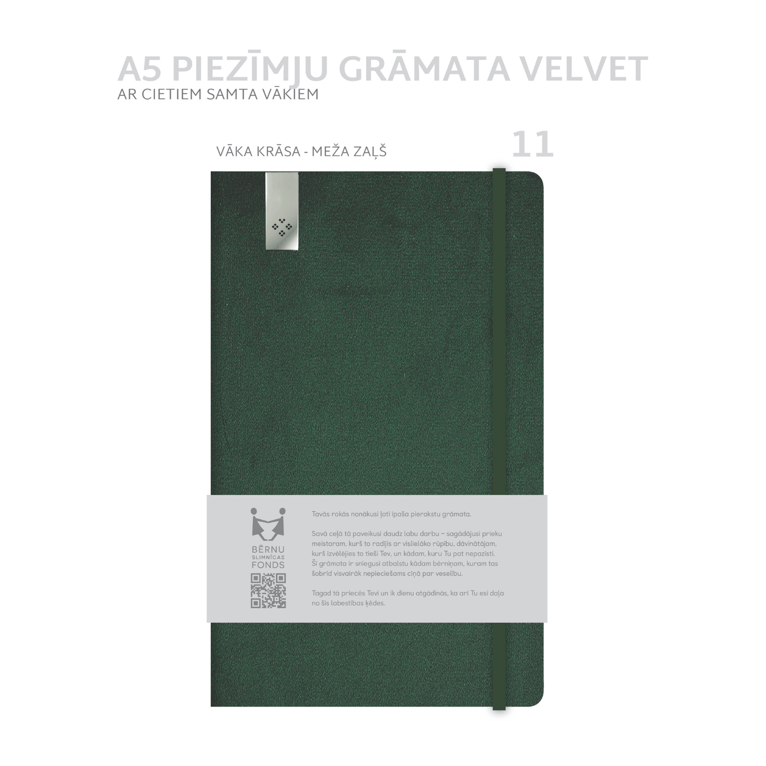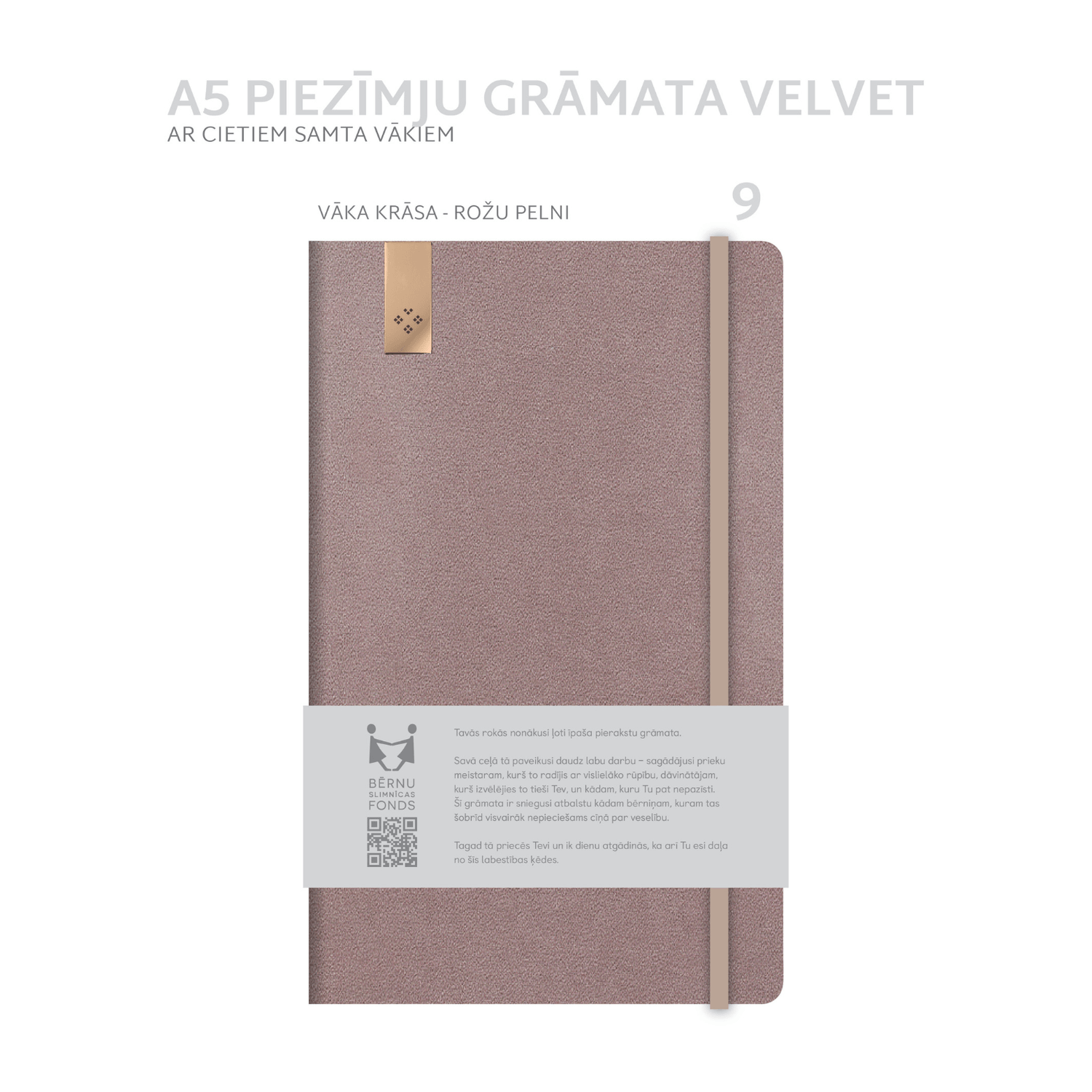 Cietā sējuma grāmata samta vākos ar gumijas aizdari.