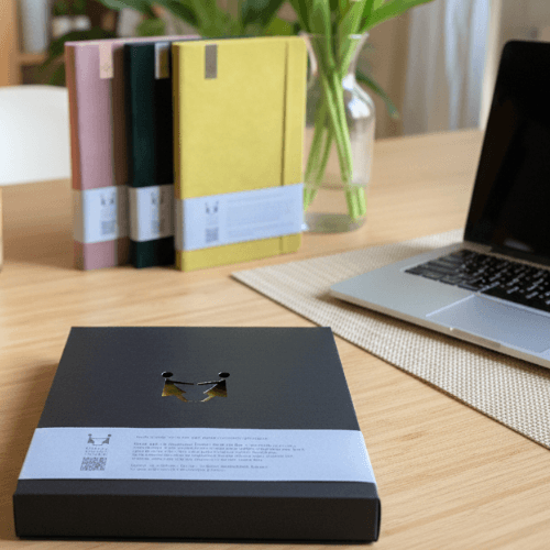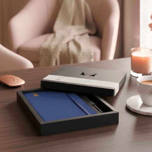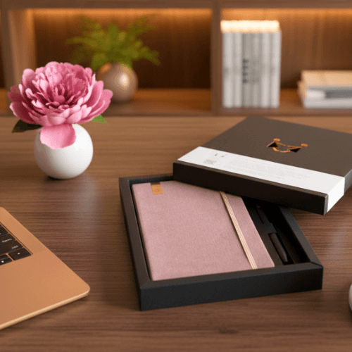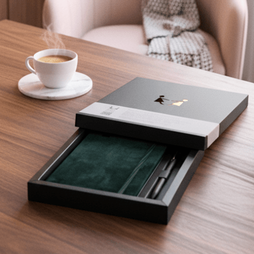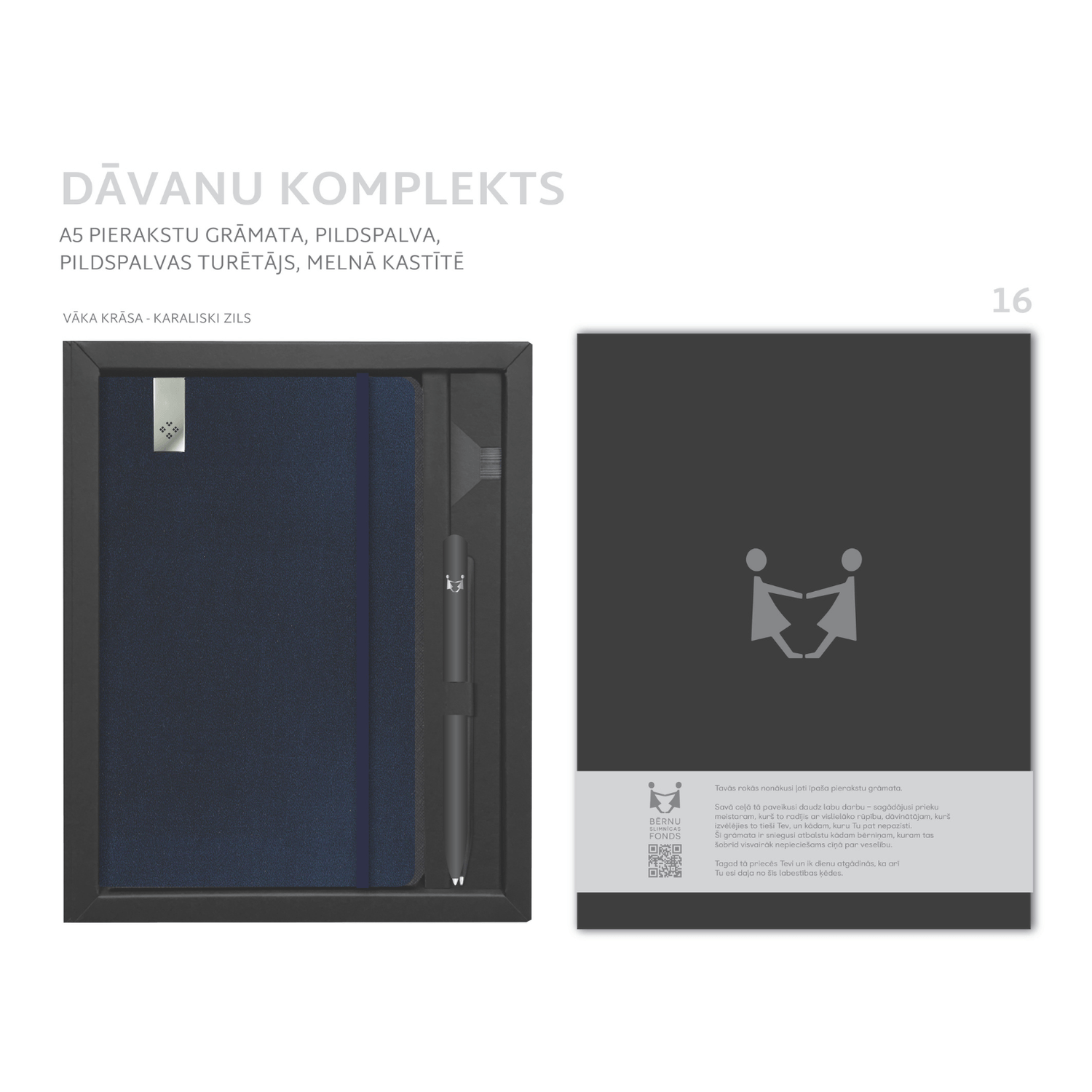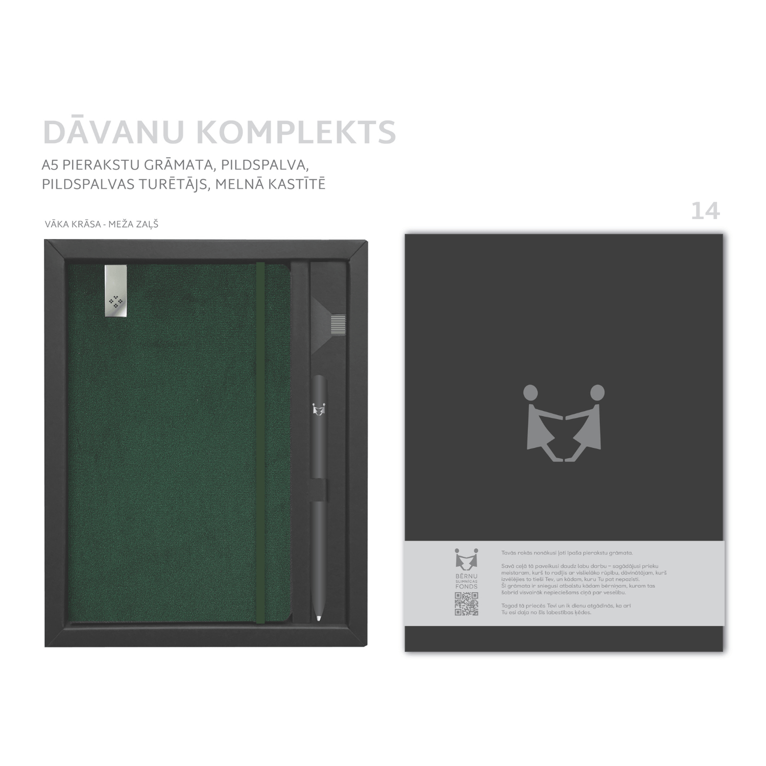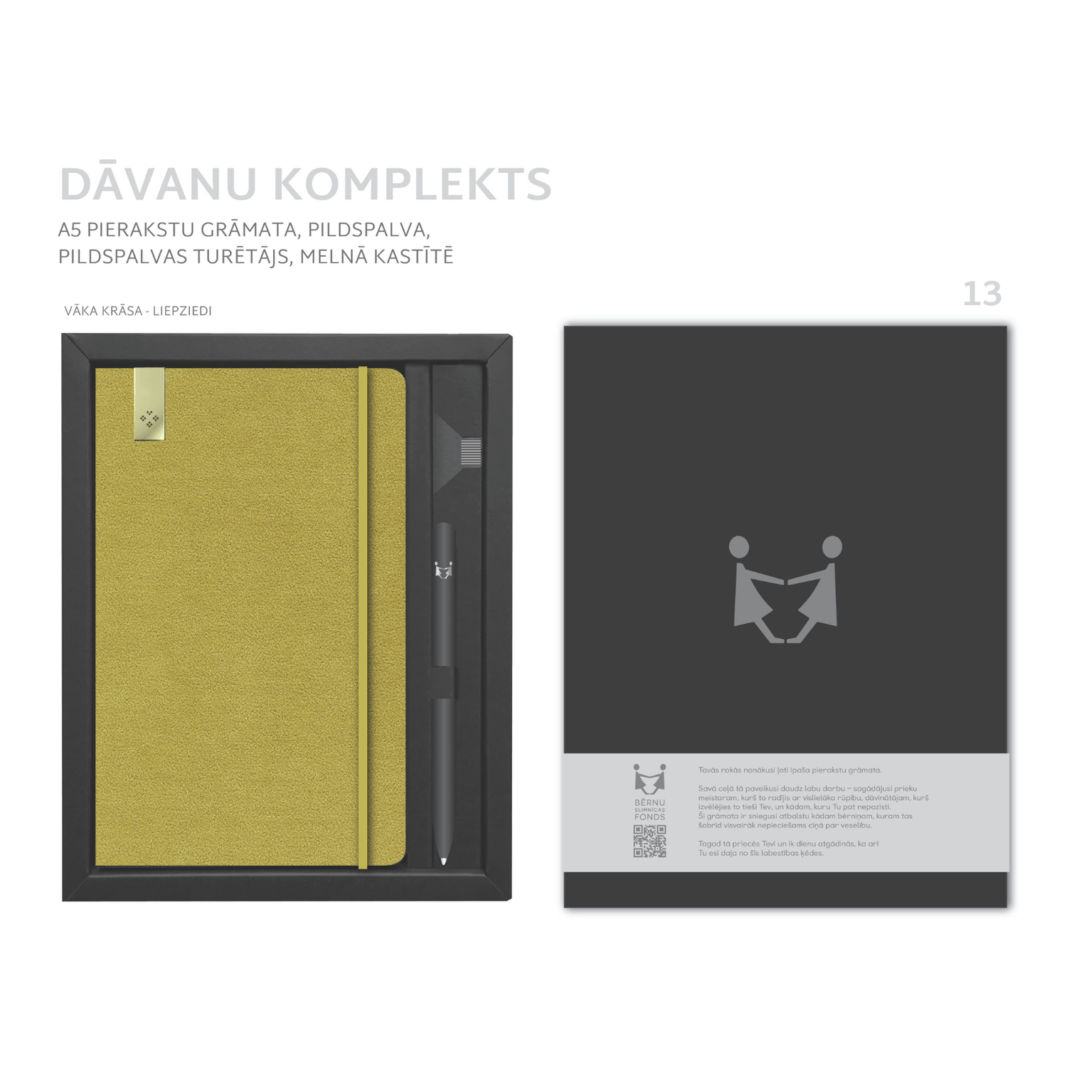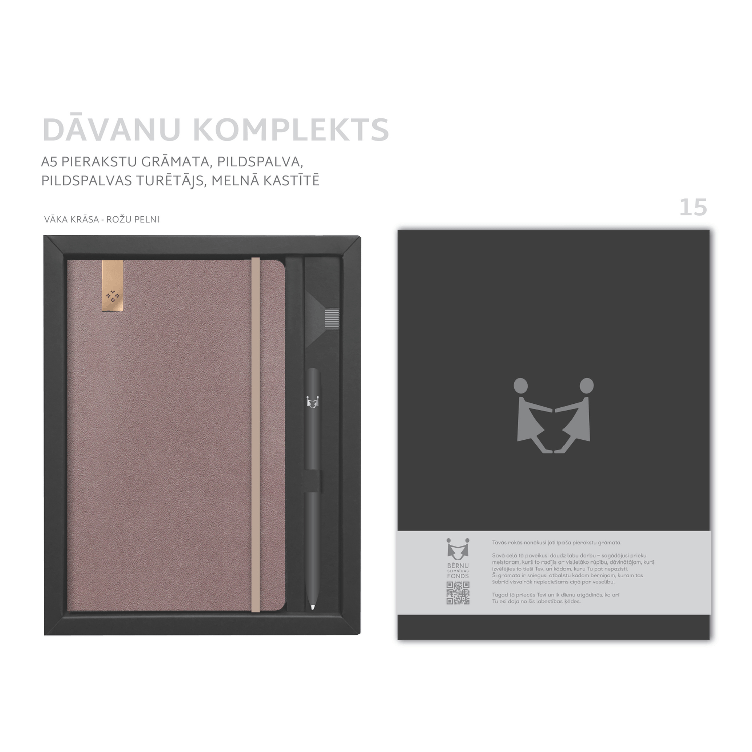 Cietā sējuma grāmata samta vākos un pildspalva dāvanu kastē.